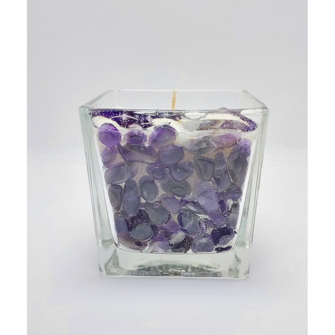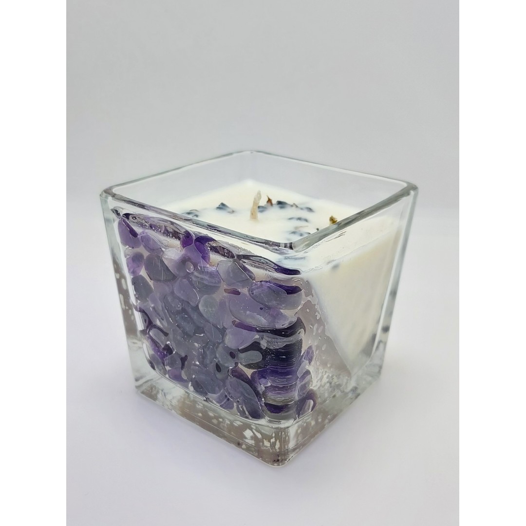 Negatif enerjiyi pozitif enerjiye dönüştüren Ametist taşlarını içeren, tamamı el yapımı, soya ve jel mum ile hazırlanan özel tasarım mum.