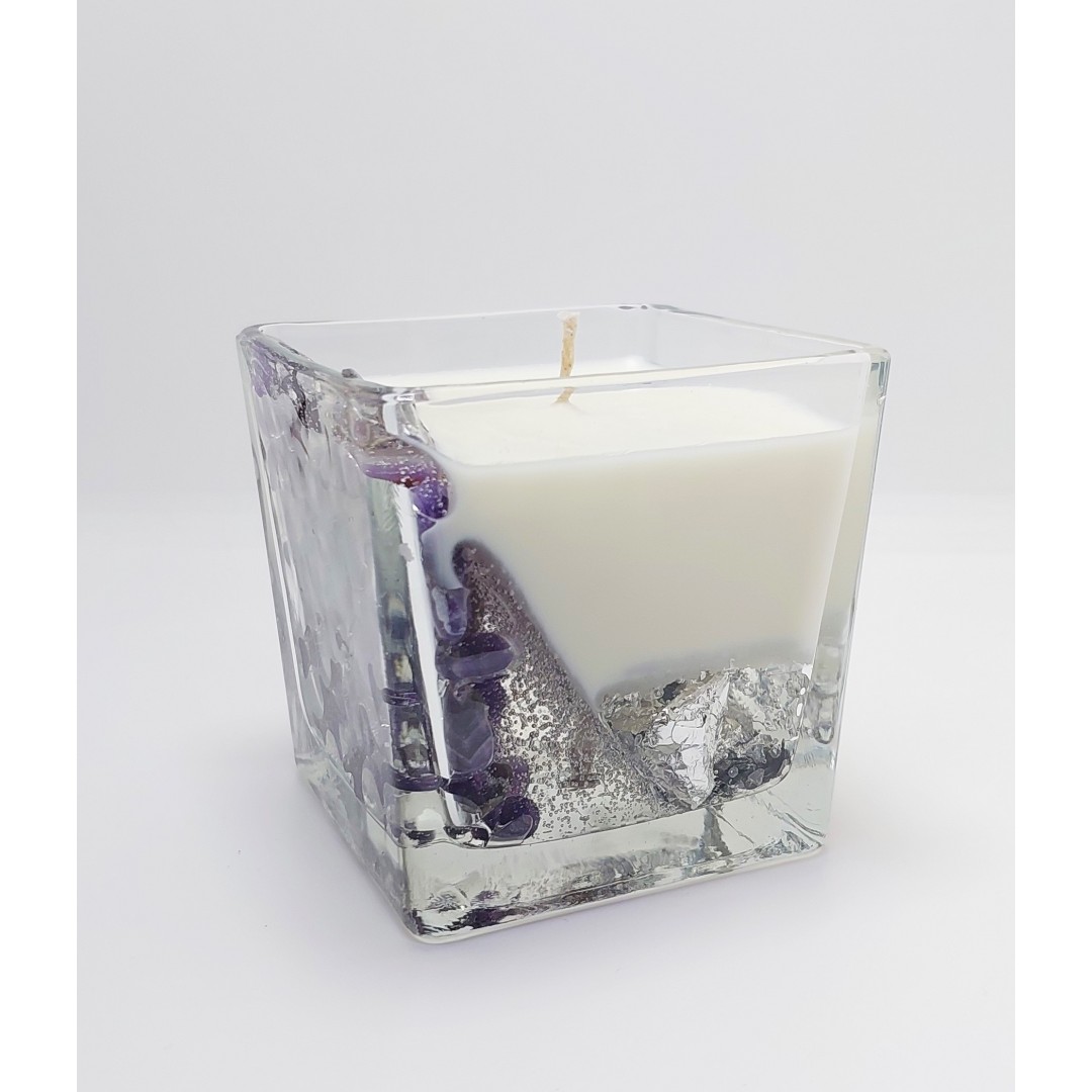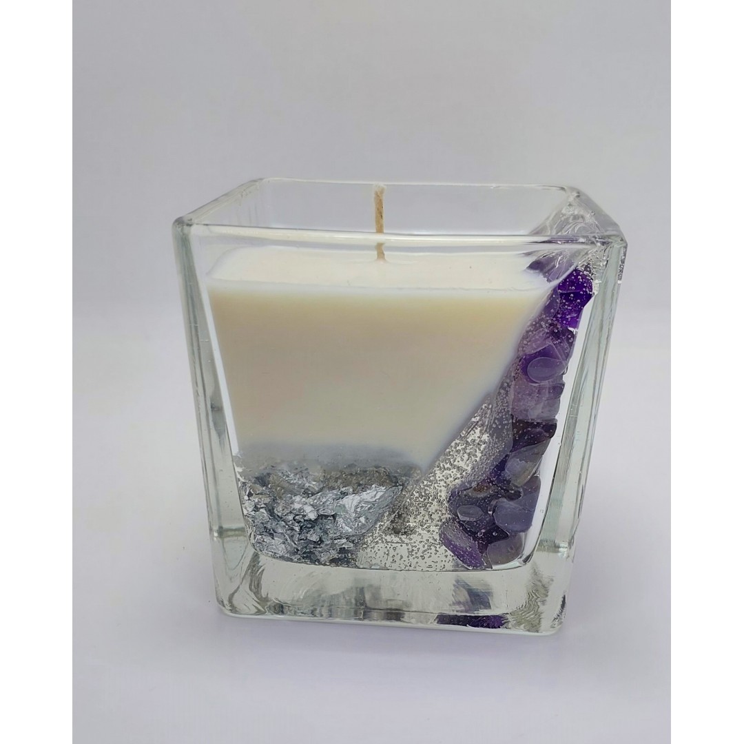 Negatif enerjiyi pozitif enerjiye dönüştüren Ametist taşlarını içeren, tamamı el yapımı, soya ve jel mum ile hazırlanan özel tasarım mum.