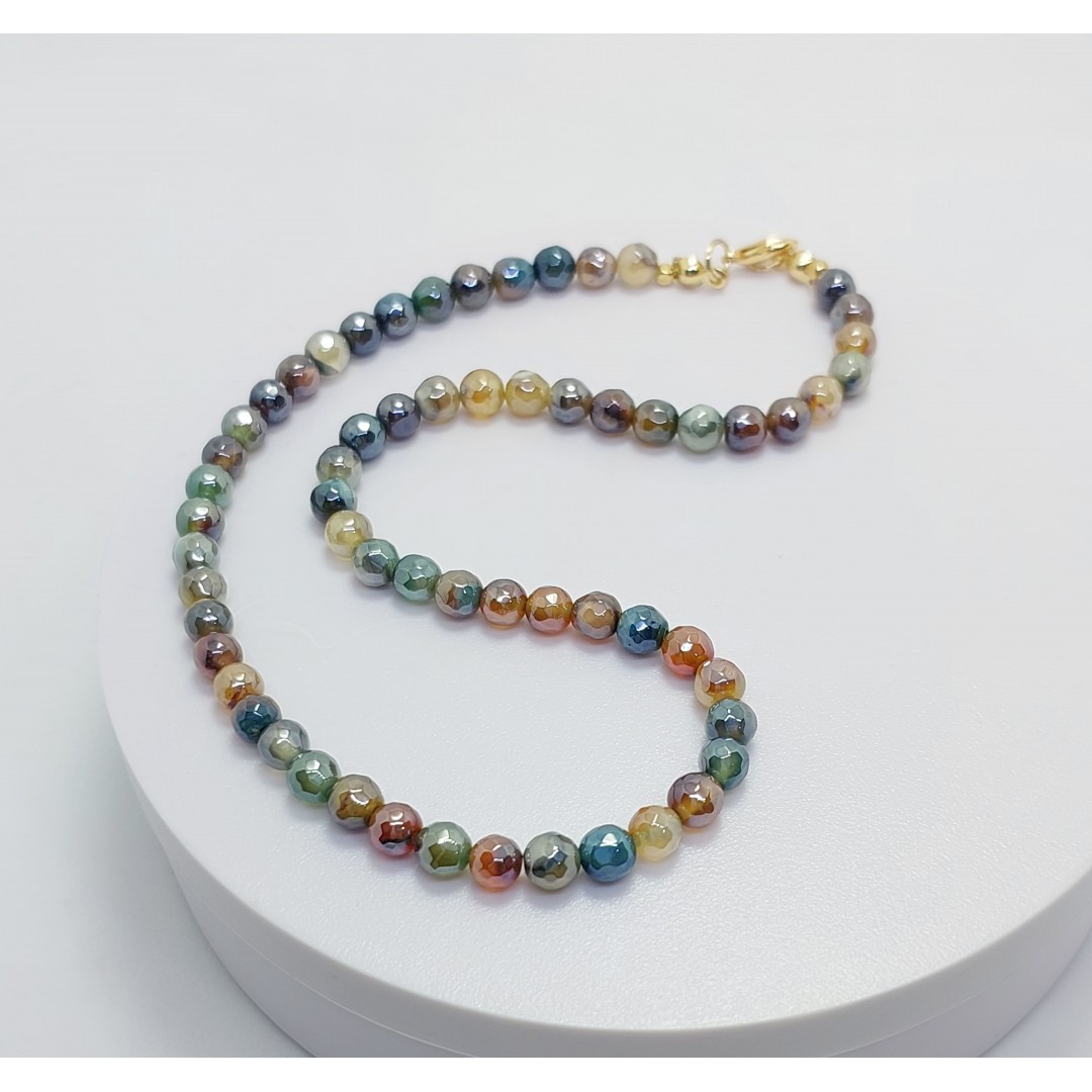 Ürünümüzü, karışık renk, arpa kesim akik taşları kullanarak oluşturduk. Kolyemiz 40cm olup herkese uyum sağlayabilmesi için ek olarak 5 cm uzatma zincirine sahiptir.