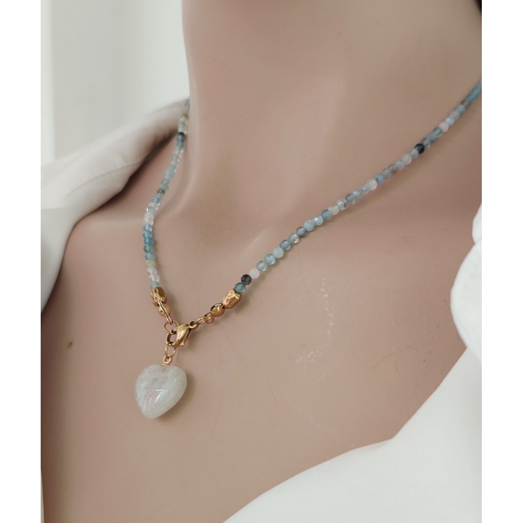 Akuamarin ve ay taşı kolye, yüksek enerjisiyle kalbinize huzur, ilişkilerinize ise şeffaf bir uyum getirir.