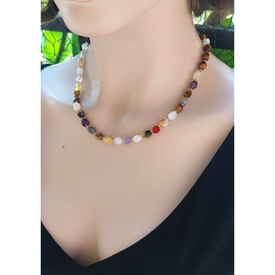*Kolyemiz, faset kübik kesim A+ kalite karışık doğal taşlar kullanılarak oluşturulmuş olup 45cm uzunluğundaki kolyemize ek olarak 5cm uzatma zinciri mevcuttur.