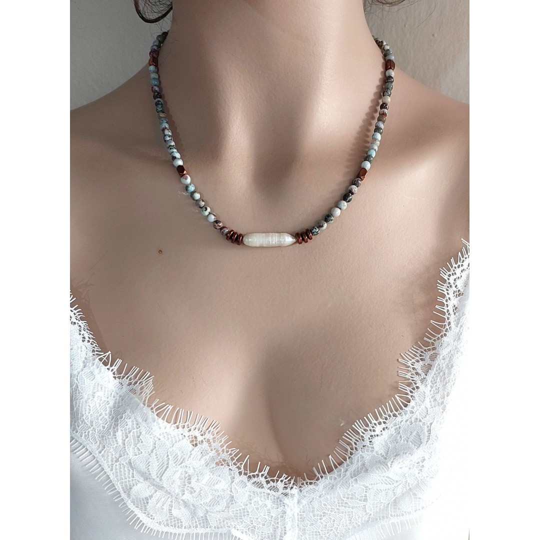 Okyanusun huzuru ile incinin zarafetini boynunuza taşıyın: Larimar taşının dingin enerjisi ve sakız incisinin asil ışıltısı, bu özel kolyede buluşuyor!