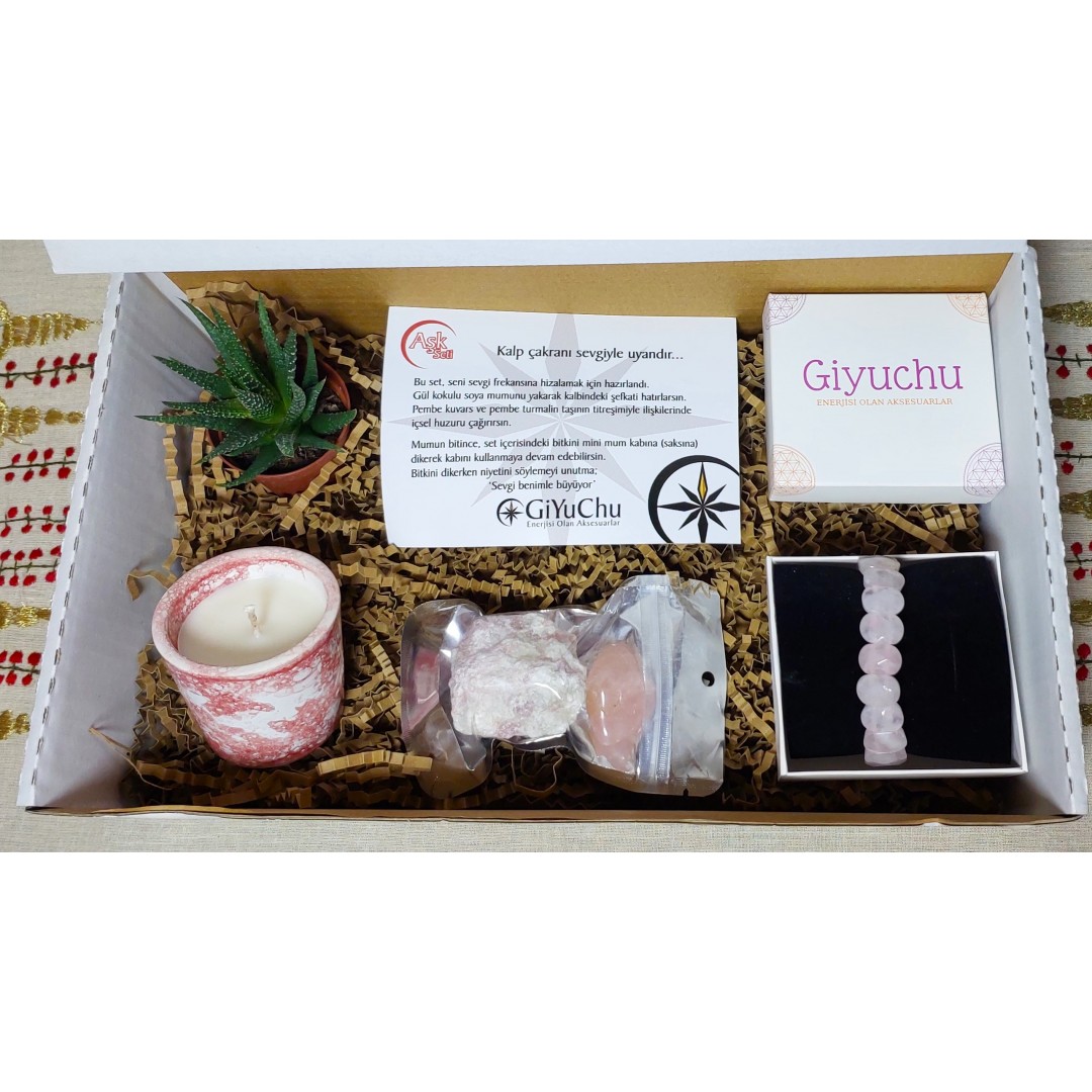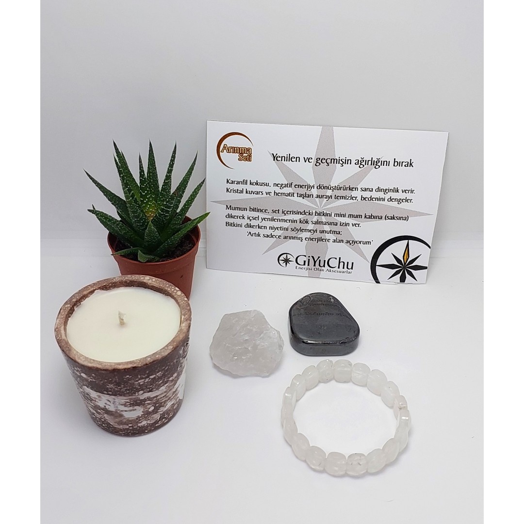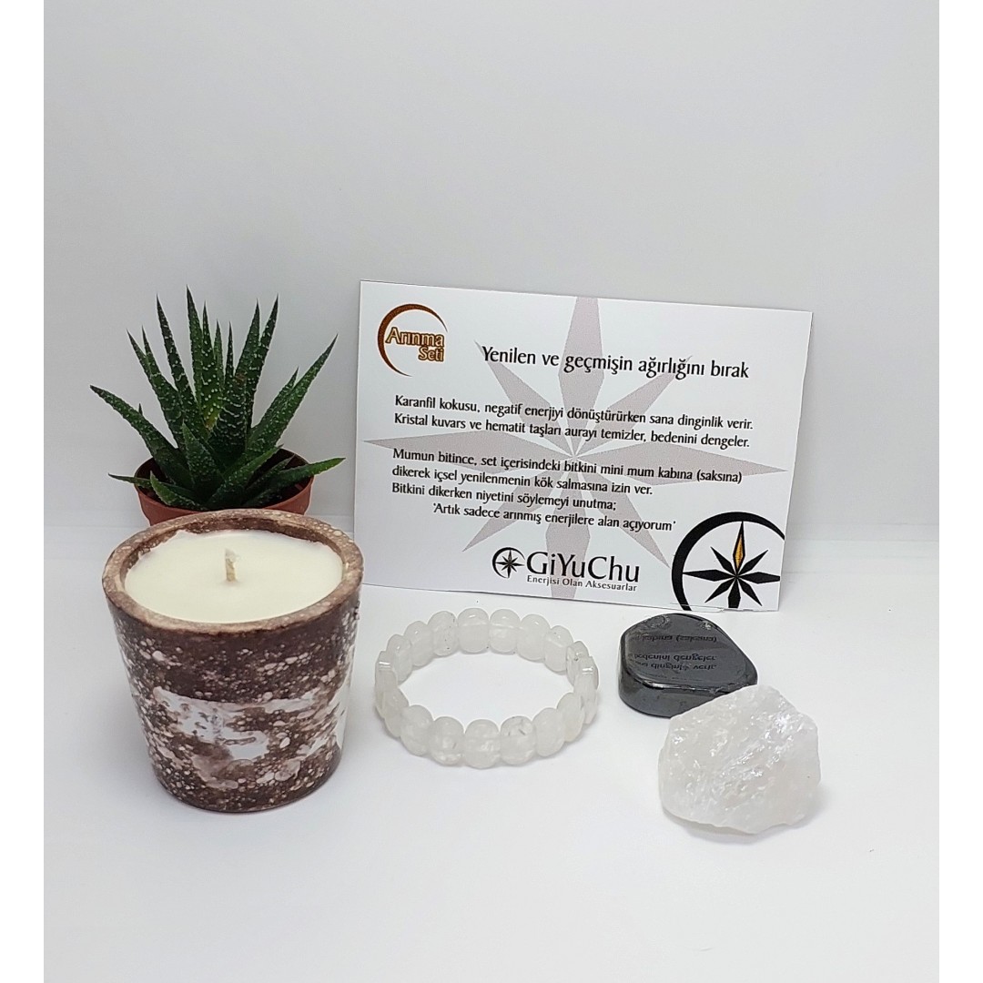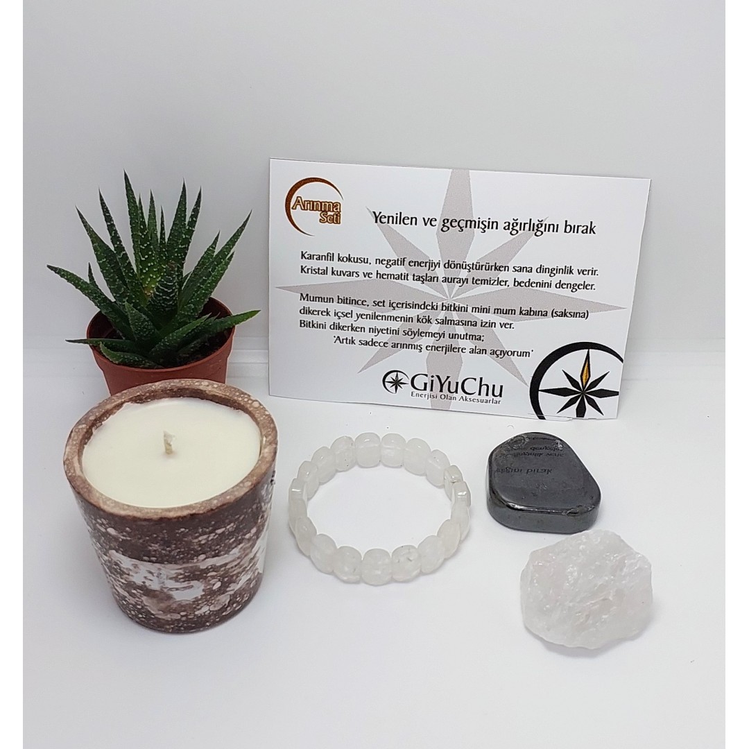 El yapımı karanfil kokulu mumun sıcak enerjisi, beden–zihin–çevre üçlüsünde sakinlik sağlar. Setin doğal taşları olan kristal kuvars ve hematit, auranı temizleyerek seni merkezine döndürür.